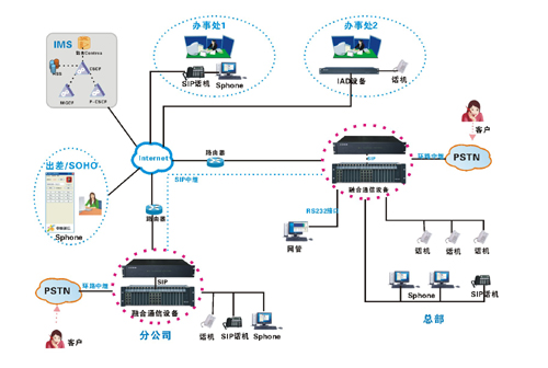 輕松實現傳統PSTN和IMS的無縫融合接入。異地分公司、辦事處可通過網絡靈活接入此系統,因此總公司與分公司之