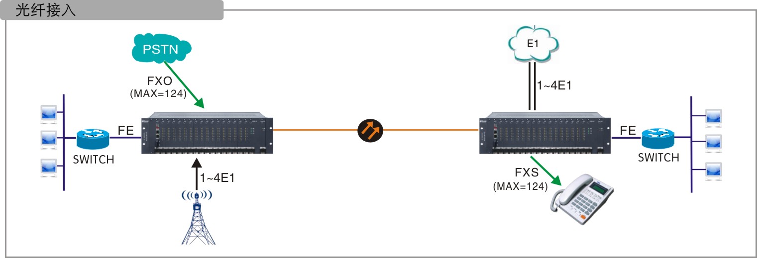 采用光纖線路傳輸,設備最大配置124路FXO或FXS、4E1、1~2路物理隔離以太網業務。