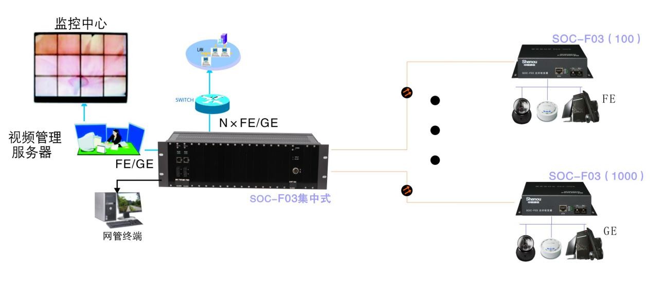 該方案局端放置一臺SOC-F03集中式業務,下放以太網(FE/GE)業務口,與各個遠端之間通過光纖直連,遠端放置SOC-F03桌面式設備,下放以太網業務口??山y一納入SOC-NM2005網管平臺,提供完善的網管功能